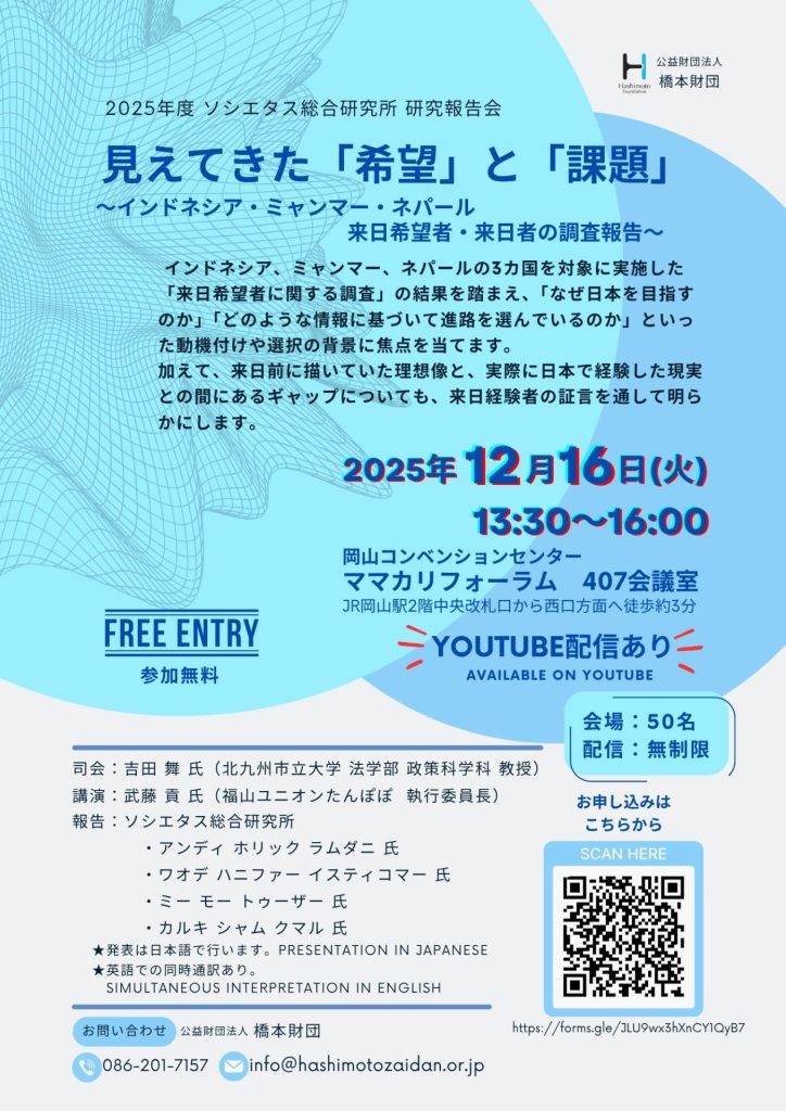 ベトナム・インドネシア・ネパール・ミャンマーの4カ国から来日した約700名の方々にアンケート調査を実施しました。本報告会では、その結果をもとに、彼らが来日前に期待していたこと、来日後の仕事や生活の様子を報告いたします。また、実際の相談事例もご紹介し、現場で起きている問題を具体的に共有します。